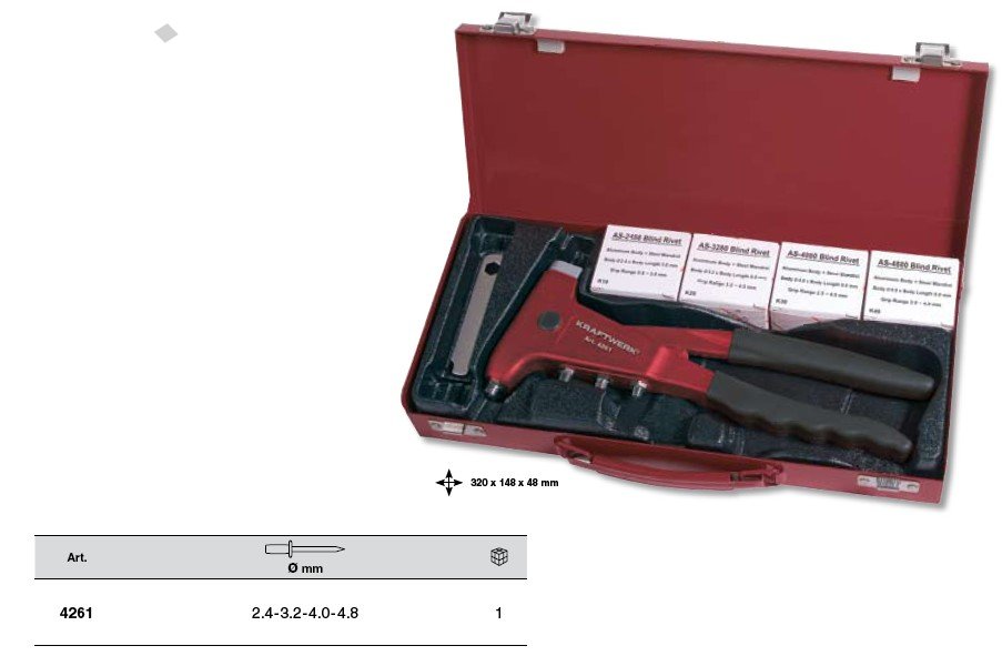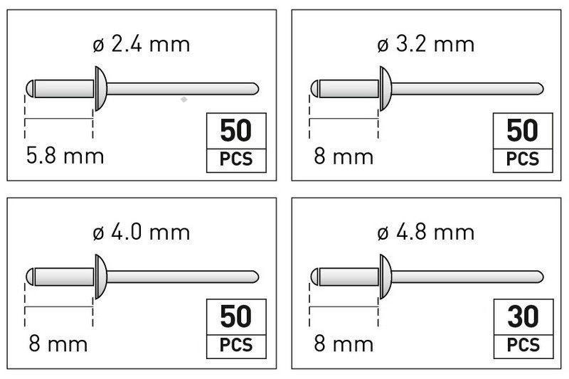 • součastí sady jsou hliníkové nýty 2,4 - 3,2 a 4,0mm á 50ks, průměr 4,8mm 30ks