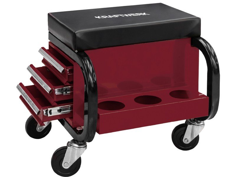 - pracovní sedátko se 4 otočnými koly - čalouněný sedák - plastová odkládací přihrádka na nářadí