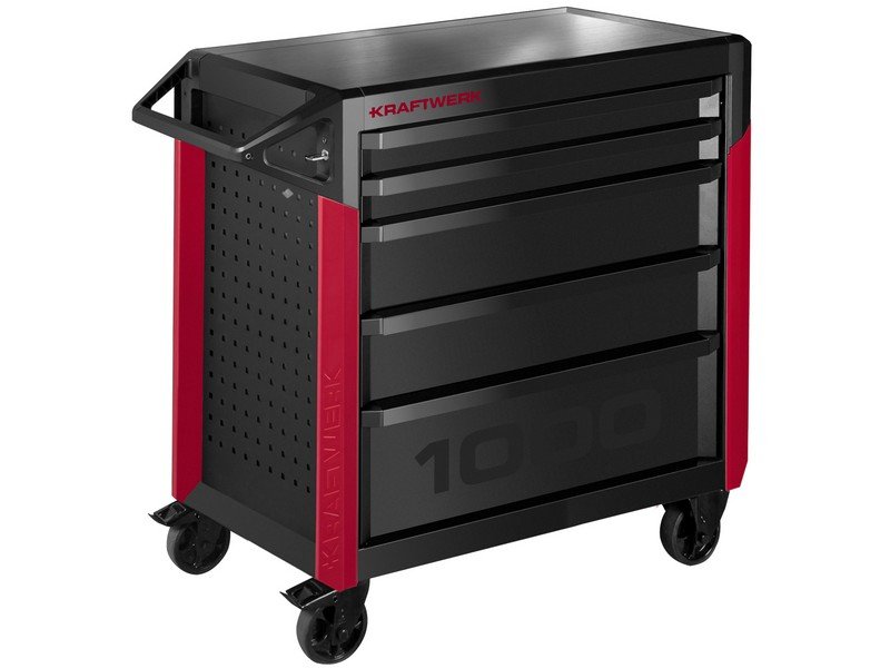 - dílenský vozík 4 zásuvky a dvířka - zásuvky na kuličkových ložiscích, lehce pohyblivé, vyjímatelné a ovladatelné - centrální zámek všech zásuvek s cylindrickým zámkem - pojistka pro otevření pouze 1 zásuvky zabraňuje současnému otevření několika zásuvek - další úložný prostor ve spodní části vozíku - s integrovaným držákem šroubováků - boční polička jako přídavná úložná plocha - vodící kola s brzdou - robustní plastová horní deska s prolisy - ochrana hran z tvrzeného plastu