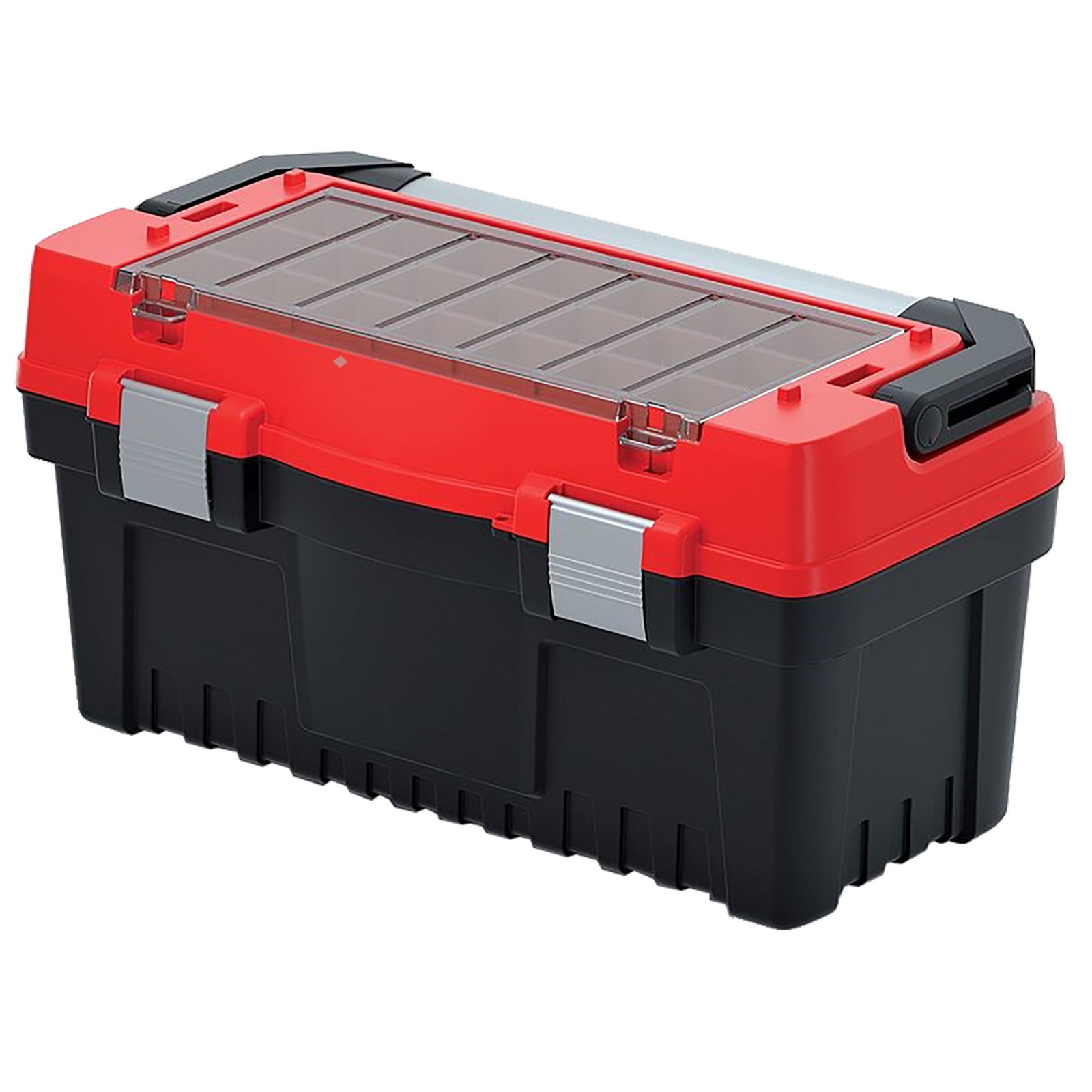Profesionální box na nářadí v kombinaci plastu a nerezu. Pevný a odolný pro vysokou zátěž, je možné jej použít i jako stupínek (max. 100 kg). Kovové přezky a oko na uzamčení visacím zámkem. Žlábek pro zakládání trubek a latí při řezání.
