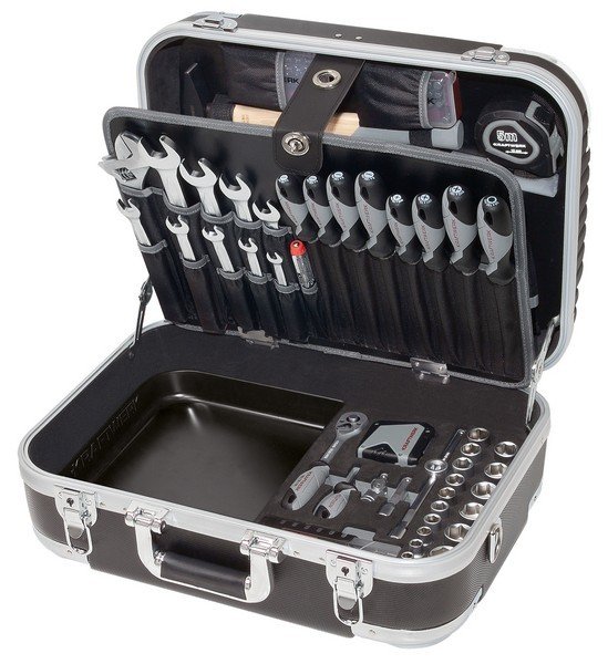 - 52 dílný kufr s nářadím pro sanitární oblast a oblast domovní techniky - flexibilní možnosti uspořádání díky individuálně rozdělitelným vložkám ve spodní vaně - krycí deska se šesti velkými pouzdry na nářadí - krycí desky a desky na nástroje z materiálu Con-Pearl® - stabilní klouby s rastrem drží víko v případě potřeby otevřené navzdory vlastní hmotnosti nářadí - dva uzamykatelné ocelové sklopné zámky - odolné provedení z materiálu ABS, černé - robustní a lehké, odolné proti opotřebení a odolné proti zkroucení